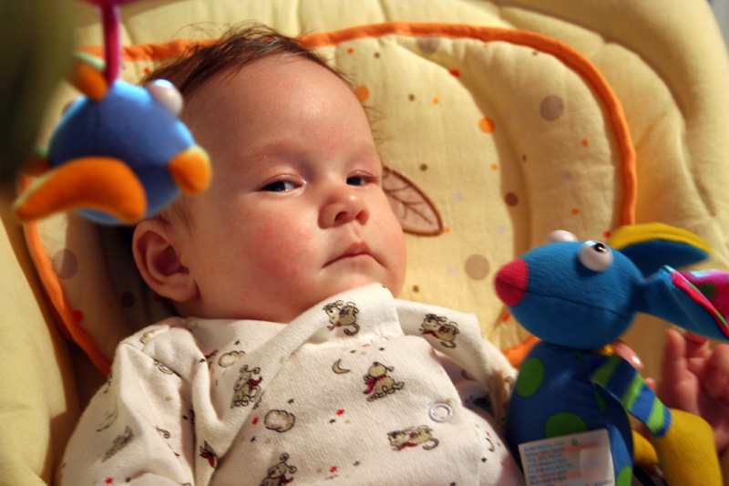 Сегодня мне 3 месяца! Я уже совсем большая - умею... много чего умею. Например, если в одну руку мне засунуть мою любимую Мышь, то я другой рукой буду хватать ее за ухо. Или в погремушку играть. И книжку люблю на животе смотреть. Но больше всего я, конечно, люблю кататься на руках у кого-нибудь.