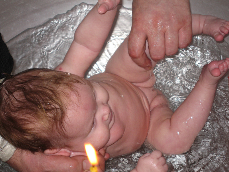 Все мы пришли в церковь, там было тепло-тепло и мы разделись. Пока батюшки готовили все к таинству крещения, выяснилось, что крестить будут только меня и еще одну маленьку девочку. За маму прочитали какую-то молитву и разрешили ей присутствовать на крещении. Потом меня забрали и отдали крестным родителям. Все было красиво и таинственно. Нас окунали в большую вазу, купель, называется, поливали теплой водичкой, мазали разными маслами. Потом одели крестики и крестильную рубашку. Роль моей крестильной рубашки играло очень чудное платьице. Дядя священник даже не взялся его на меня надеть, поэтому все делали мои крестные родители. Потом я ездила на руках у крестных, пока они ходили со свечками вокруг купели. В конце концов батюшка отнес нас к алтаю, дали нам что-то сладкое и вкусное и отдали мамам. Теперь в церкви меня зовут Аглаида.