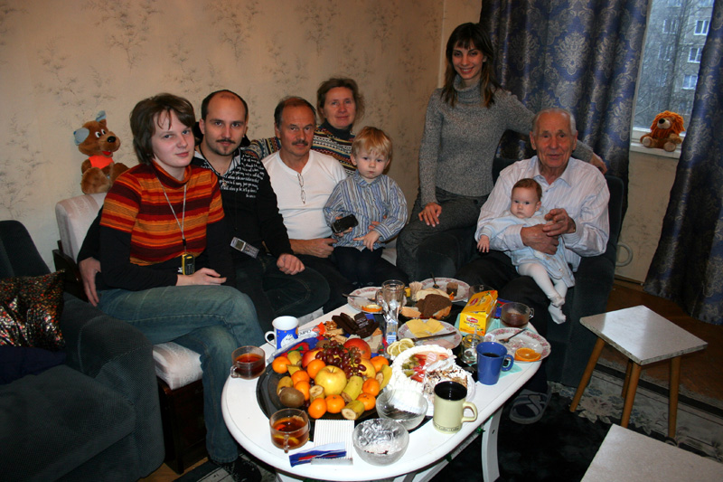 В этот же день я с родителями и Никодимкой успела съездить на ёлку к папе на театральную студию. Я была нарядной и никого не боялась, а все кругом мне очень радовались, какая я хорошенькая. Там нам с Никодимкой тоже надарили разных подарков. Когда мы вернулись назад к бабе Вале, там нас уже ждали тетя Вера, дядя Даня и мой прадедушка Федя. Он прилетел к нам на праздники в гости. Я еще мало кого знаю, поэтому и его видела в первый раз. Но он мне сразу понравился: он так хорошо играл со мной, разговаривал и носил на руках!