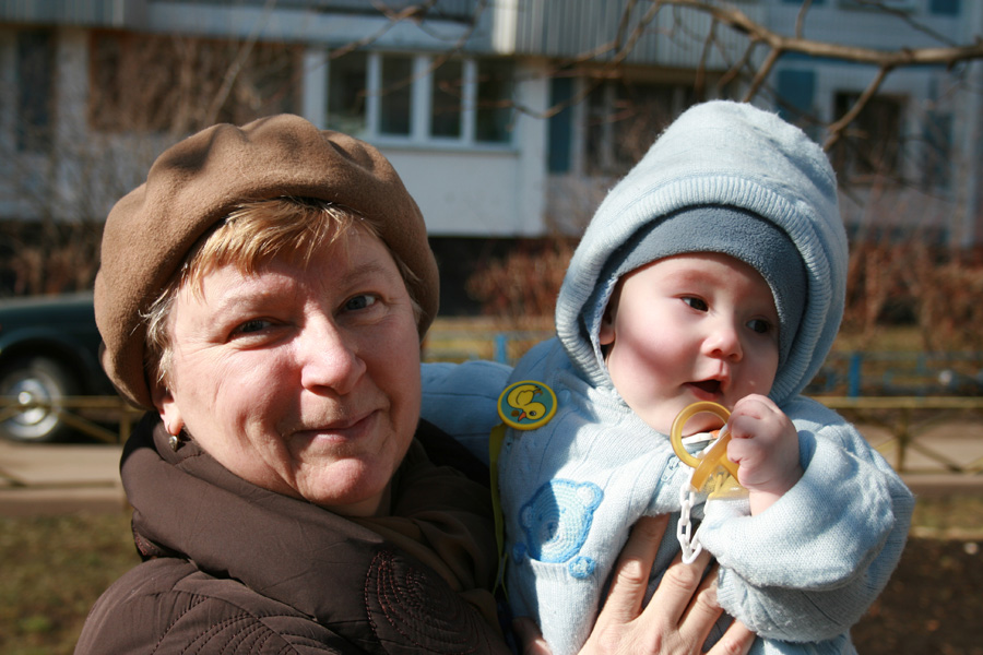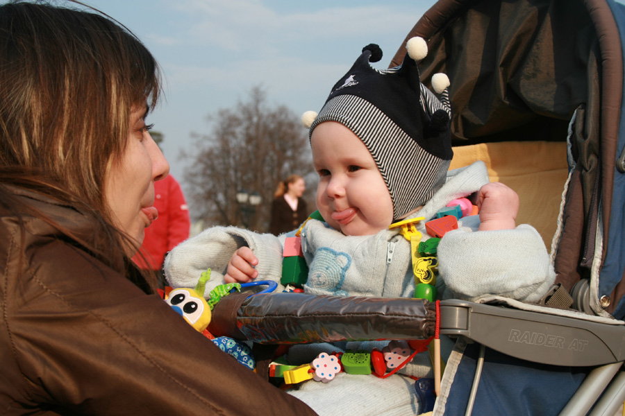 Потом я встретила тетю Олю с Женей. Он маленький и лежит еще, даже голову не держит. Поэтому я его соской угощала, которую сама грызла. А потом нас положили в коляски и повезли гулять. А на улице тепло было, +11С!